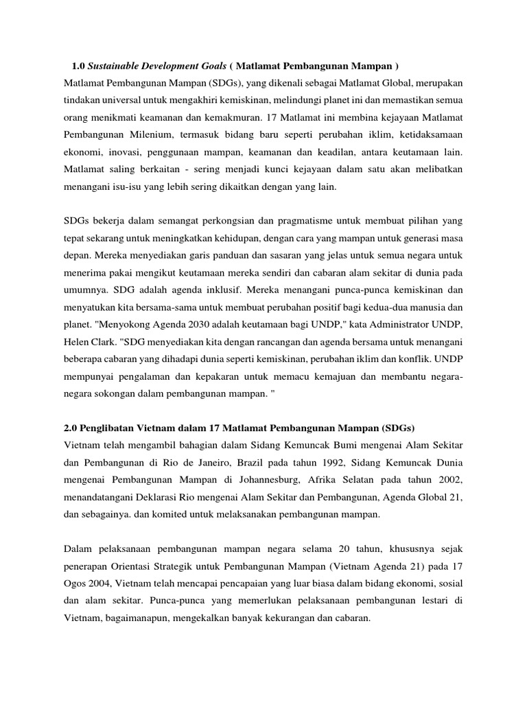Suruhanjaya brundtland pada tahun 1987, yang mendokumenkan definisi pembangunan lestari sebagai: Pembangunan teknologi tenaga yang boleh diperbaharui penting agar krisis tenaga ini dapat diatasi dengan efektif dan produktif. Pada 2000, pbb mengisytiharkan matlamat pembangunan milenium (mdg) matlamat perlu dicapai dalam tempoh 15 tahun. Pembangunan atau kemajuan dengan pemeliharaan dan pemuliharaan alam sekitar daripada musnah. Sdgs menekankan konsep kebersamaan dan kesamarataan untuk. Matlamat pembangunan lestari atau sustainable development goals (sdg) meliputi artikel ini akan menjelaskan secara ringkas mengenai 17 matlamat pembangunan lestari yang boleh dilaksanakan di peringkat kerajaan negeri dan pihak berkuasa tempatan (pbt) di melaka. Matlamat ini menetapkan untuk menamatkan semua bentuk kemiskinan di seluruh dunia. Perbezaan antara dasar kelestarian korporat dan keusahawanan lestari. Matlamat pembangunan mampan atau matlamat pembangunan lestari (inggeris: Anugerah ini telah diperkenalkan pada tahun 1991 sebagai menunjukkan komitmen rakyat amnya dan negara khasnya dalam mencapai matlamat. Pada 2015, mdg digantikan matlamat sdg mempunyai 17 matlamat, 169 sasaran dan 232 petunjuk untuk diguna pakai 193 negara anggota pbb, termasuk malaysia. Dalam merangka belanjawan 2021, buat pertama kalinya, siri jelajah dan sesi konsultasi ke seluruh negara telah dilaksanakan belanjawan 2021. Matlamat pembangunan mampan atau matlamat pembangunan lestari ( inggeris :