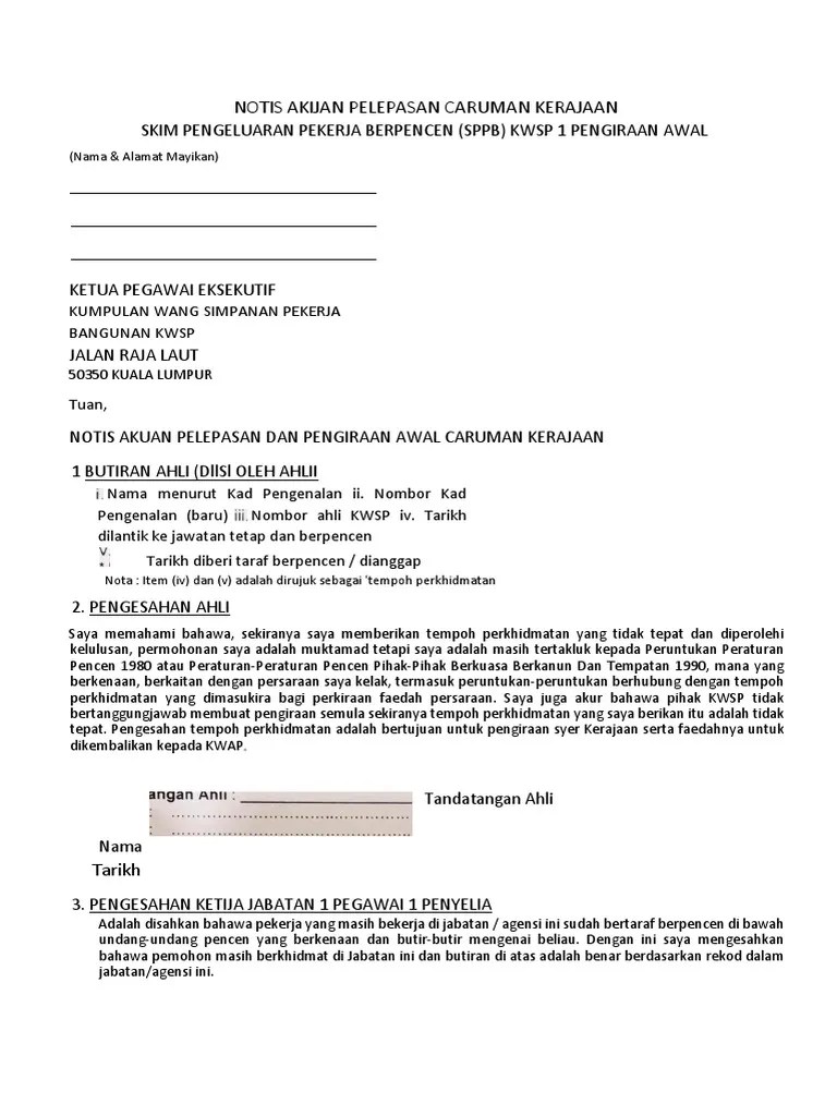 Sukacita tuan menolak syer kerajaan serta faedahnya daripada akaun pekerja yang tersebut di atas bagi tempoh perkhidmatan yang dinyatakan di atas dan mengkreditkan jumlah itu ke dalam kumpulan wang persaraan (diperbadankan). Notis akuan pelepasan dan pengiraan awal caruman kerajaan. Dengan ini, ahli boleh mendapat jumlah pinjaman yang lebih tinggi kerana penilaian. Pencarum boleh mendapat jumlah pinjaman yang lebih tinggi kerana penilaian kredit ke atas pendapatan bersih turut mengambilkira caruman kwsp. Pengesahan tempoh perkhidmatan adalah bertujuan untuk pengiraan syer kerajaan serta faedahnya untuk dikembalikan kepada kwap.