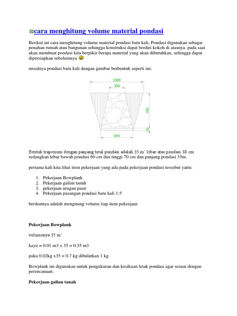 Cara Menghitung Volume Pondasi Foot Plate dan Batu Kali from hargabli.com Cara menghitung volume pondasi bangunan. We did not find results for: Check spelling or type a new query. Maybe you would like to learn more about one of these?
